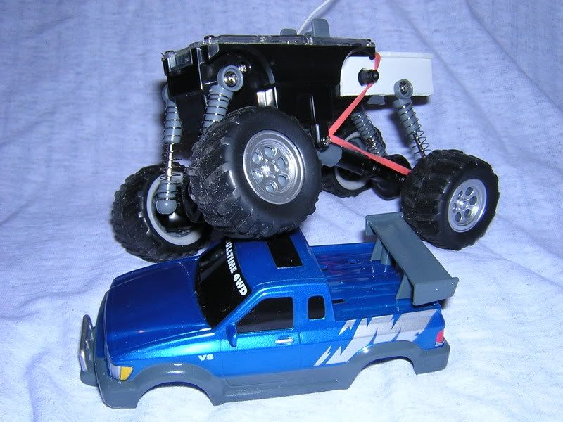 if you take apart a retractable ink pen, you will notice that the ink tube has a spring on it. there are two indentions on the tube made to hold the spring on, cut the tube right there and you will find that it fits the rear u-joint perfectly. the other end has a small brass grommet glued to the rear end and the ink tube. i'm pretty sure they use diffrerent pcb's as the car has both turbo and three selectable frequencies. you really wounldnt want a turbo on this truck anyways. i need to find a little taller tire the will fit the stock wheel to make it a little more scale, if anyone knows of a tire that will fit let me know.