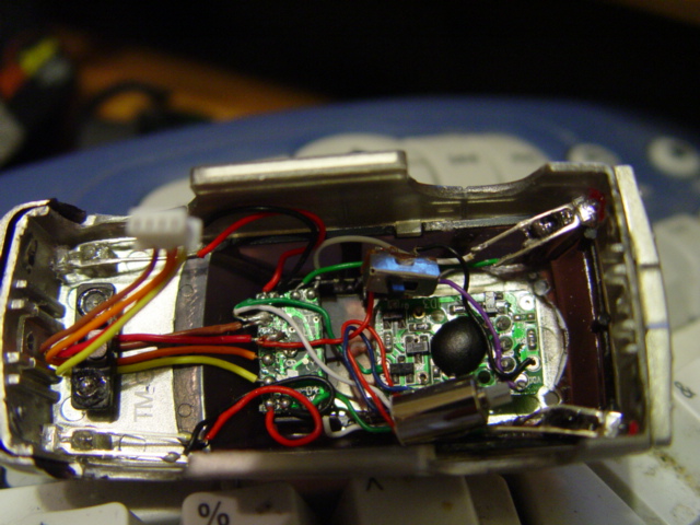 The transmitter was a 49mhz ZZ-M, it now features a steering wheel button for right/left control, a pair of microswitches in the upper surface that are protected when charge cover is closed, an LED shroud on the left side, and a cut down IR Rods TX circuit board inside