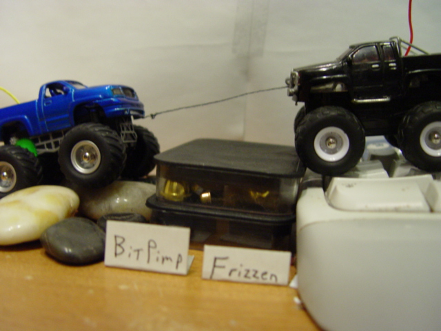 Yep, totally. I'm not laying cable, I'm just trying to winch myself out of here. Some people have done 3rd channel for the winches, I'm not sure how they did it, nor do I plan on doing it anytime in the near future. Mine is gonna be a little different. Low-Tech, a brass hair spring providing retract tension for cable. Can't use it to winch up stuff but you use it like a "dead rope", hook onto other truck, both of you put in gear going same direction, both trucks are able to move past obsticle. Works best when they're geared pretty close to the same, but my 'fastest gear, fastest motor truck' can pull my 'lowest gear, lowest motor, crawler gear truck' up the 2" edge of my keyboard that way, so it should be enough for the micro trails.