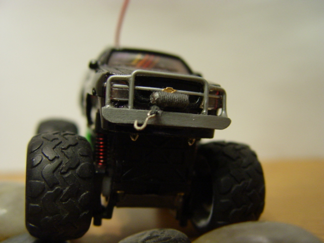 Body mods to "Desperado" used: Paperclips, sheet styrene, necklace chain, jump ring from end of necklace chain, thread, little Epoxy, little CA... There's going to be a thread wrapped drum, a coil spring out of a clock, and a plastic rim off a McToy pullback to finish off the winch. If you've got any questions about doing anything shown on this truck, please ask!