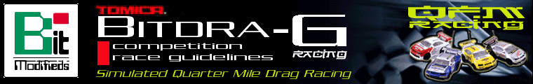 BitDra-G events are separated into separate classes called divisions. Each division seeks to address a specific type of Bit Hobbyist and car configuration. A full BitDra-G competition using all divisions would effectively encompass the whole spectrum of Bit Hobbyists and range of car types (excluding track or lap races). Division races can be held simultaneously if enough square footage exists, however it is recommended that the BitDra-G competition be executed in division order, to build anticipation for the Super Modified races, as well as limit any chances of inadvertent frequency interference by participants and their controllers. The divisions are as follows: